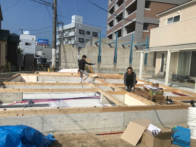 1階の柱、梁を搬入したら、上棟までしっかりシートで養生しておきます。